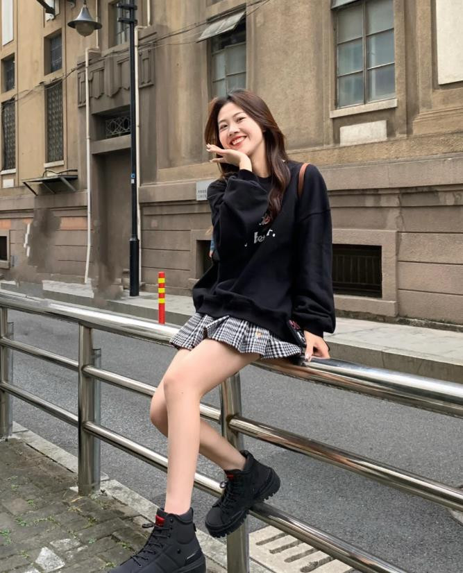 黑色的圆领卫衣,这种颜色可是最经典百搭了,也是秋日衣橱常见的款式,宽松的版型,很好营造出休闲随性的范,下身搭配黑白格纹半身短裙,经典的格纹元素,复古气息满满,百褶的设计更是增添了俏皮感,脚上搭配一双黑色厚底短靴,拉长腿部线条比例,又显高挑,卫衣与短裙的融合,整个look甜酷十足。