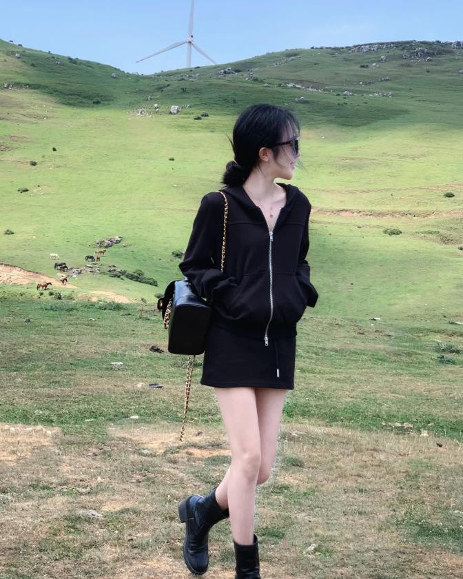 一整套都是以黑色为主色调,营造出几分酷飒与利落感,黑色连帽拉链卫衣,穿得很自在随性,连帽的设计更是增添了几分休闲与活力,下身搭配黑色短裙,巧妙露出腿部线条,既显得青春又多了几分小性感,搭配一双黑色短靴,酷帅的街头风就有了,黑色链条包,与黑色穿搭形成对比,增添了时尚亮点。