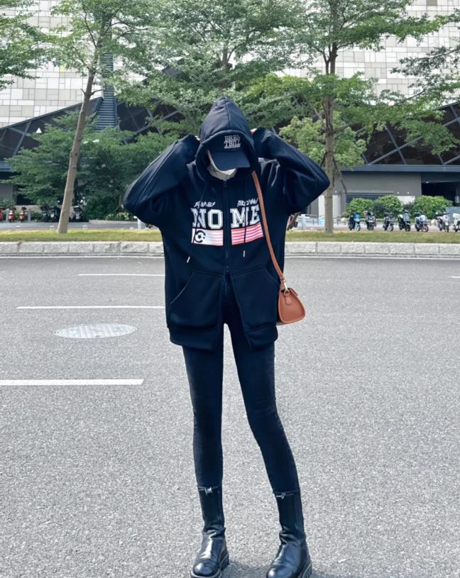 除了套头款式的卫衣之外,这种拉链款的卫衣外套也是深受众多女宝宝的喜欢,整个穿搭偏向休闲酷飒风,黑色连帽拉链卫衣,宽松的版型显得很随性自在,胸前字母和图案的设计,为简约的设计增加了亮点,下身搭配黑色紧身裤,勾勒出完美的腿部线条,与宽松的卫衣形成了对比,这样的搭配很好优化了身材比例,再搭配一双黑色短靴,酷感十足又时尚。