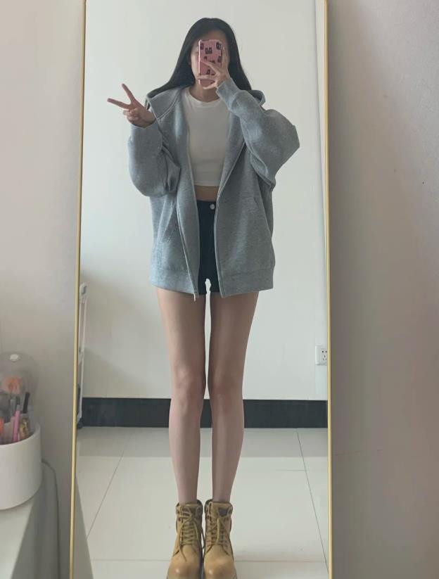 真的很喜欢这种休闲又不失时尚感的打扮,早秋季节,这样穿正合适,浅灰色的连帽拉链卫衣,内搭一件白色短t恤,轻松勾勒出腰线,宽松的版型,更是营造出随性与慵懒感,下装搭配黑色短裤,腿部线条瞬间被拉长了,脚上穿的棕黄色马丁靴,硬朗的外观为整体造型增添了酷帅感,同时也让腿部看起来更修长。