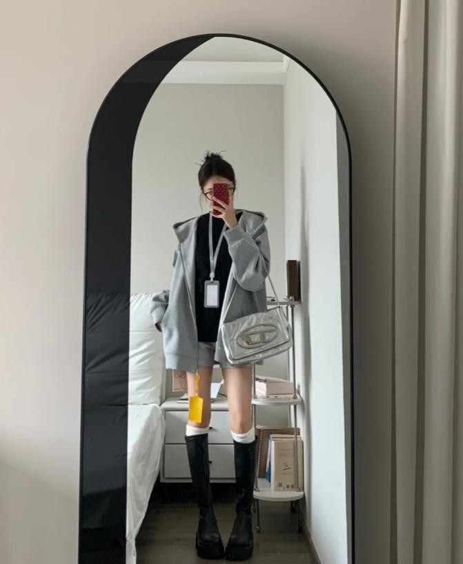 如果不喜欢卫衣配短靴,也可以试着配长靴呢,不管是小个子还是高挑的身材都可以驾驭,浅灰色连帽开衫卫衣,喜欢这种宽松的版型,很容易打造出慵懒随性范,内搭黑色上衣,形成了色彩层次感,下装配的是浅灰色短裤,增添了清爽感,加上黑色厚底长靴加持,不仅拉长腿部线条,还为整个造型注入了酷帅的街头风。